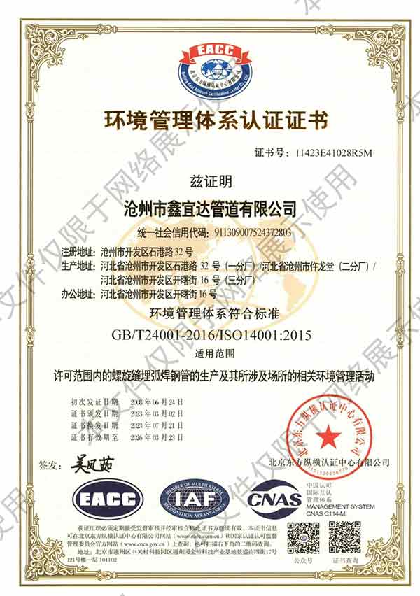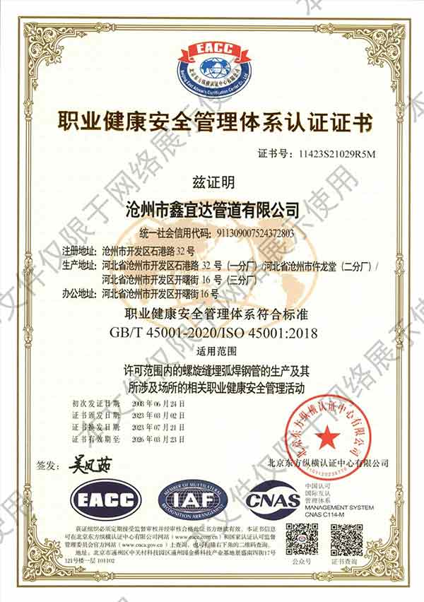 滄州市鑫宜達管道有限公司成立于2003年7月,坐落于滄州經(jīng)濟開發(fā)區(qū),占地面積40萬平方米,注冊資金1.81億元,是集螺旋鋼管生產(chǎn)、防腐加工以及無縫鋼管、卷板、帶鋼等品類鋼材經(jīng)營銷售于一體的工貿(mào)型企業(yè)。公司現(xiàn)有員工400多人,其中,中高級技術職稱的人員達120余名。 滄州市鑫宜達管道有限公司擁有9條螺旋鋼管生產(chǎn)線和3PE防腐生產(chǎn)線,可生產(chǎn)直徑219--3640mm,壁厚5.5--28mm,最高鋼級X100的各種規(guī)格防腐螺旋鋼管...